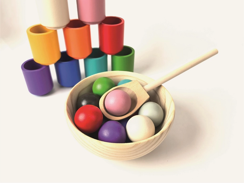 Sættet indeholder skål, ske, kugler og kopper i 12 regnbuefarver. Takket være den høje kvalitet i FSC-træ er legetøjet holdbart, sikkert og behageligt at røre ved. Perfekt til hjemmebrug og børnehaver.
