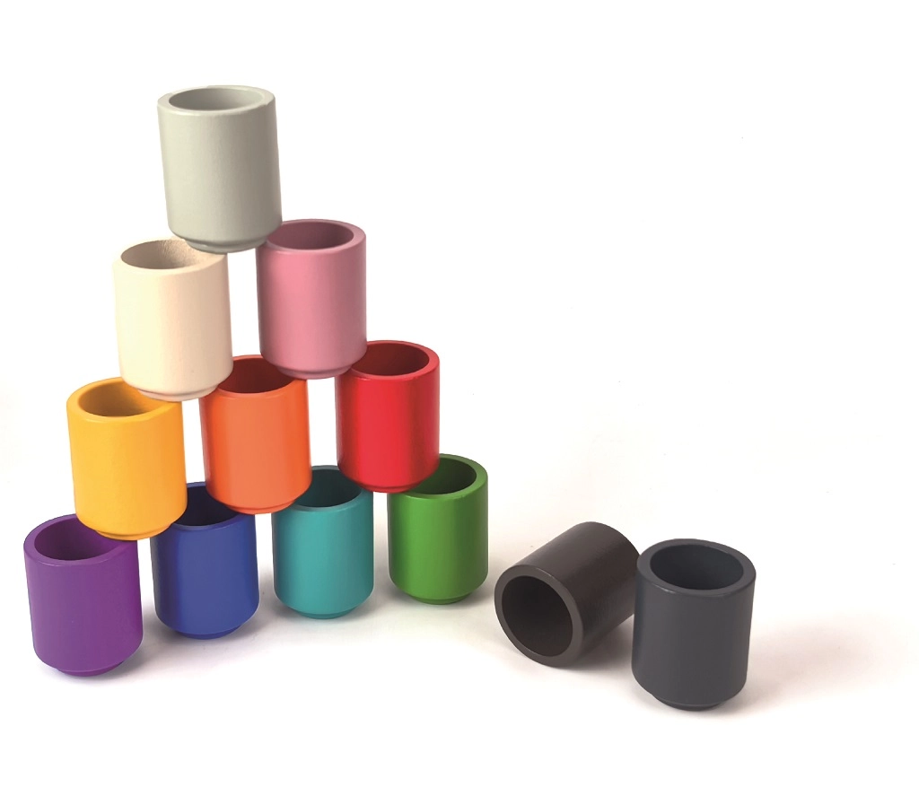 Sættet i 12 regnbuefarver understøtter genkendelse og matchning af farver, førmatematiske færdigheder samt koncentration.