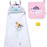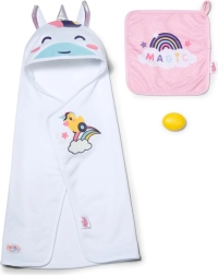 Dette magiske BABY born håndklædesæt bringer alt, hvad du behøver til sjove baderitualer. To håndklæder med regnbue- og enhjørningemotiv glæder enhver lille omsorgsperson, mens hætten med regnbuehorn og søde ører giver hver tørring et muntert præg.
