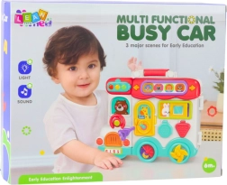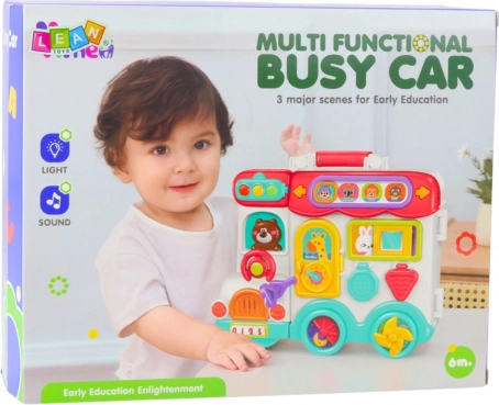 Den interaktive bil “Busy Car” kombinerer en læringsplade, formsorterer, lille klaver og bevægelige elementer, som motiverer børn til at udforske farver, former, lys og lyde. Børn kan trykke på lysende knapper, åbne låger, dreje hjul, skubbe elementer og dermed udvikle øje–hånd-koordination, finmotorik og fantasi.