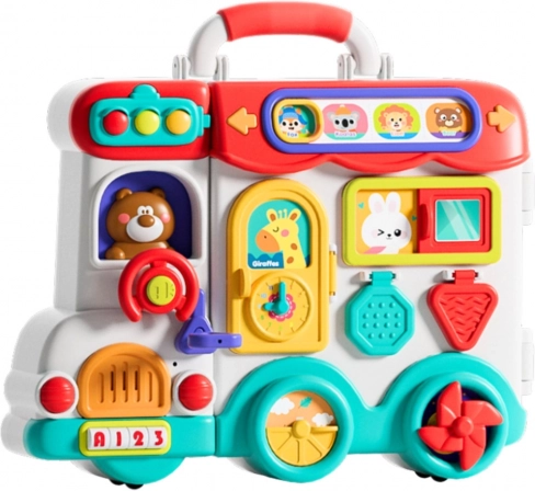 Oplev sjov og læring i ét med denne interaktive læringsbil. Den tilbyder lys- og lydeffekter, lille klaver, formsortering og masser af manuelle elementer til at udvikle finmotorik og logisk tænkning. Kan bruges som et fold-ud panel eller lukkes som en praktisk kuffert – ideel derhjemme og på farten.