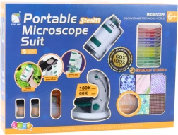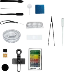 - Mini-mikroskop, justerbart stativ med LED, håndledsrem, lup, telefonholder, 2× prøveflasker, tredobbelt inkubator med objektglas, beholder til præparat med objektglas, pipette, kniv, skovl, pind, pincet, 12 færdige præparater, 4 tomme objektglas, farverig emballage