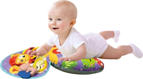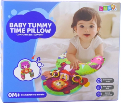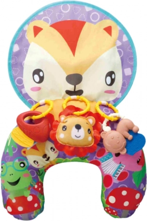 Blød støttepude til babyer hjælper med at træne mavetid og styrker nakke-, skulder- og rygmuskler. Inkluderer 3 aftagelige ophæng i forskellige former og farver til udvikling af finmotorik samt en knitremåtte med rævemotiv til sanse-stimulering og forståelse af årsag–virkning. Ideel som gave til nyfødte og som praktisk hjælp til daglig leg og udvikling.