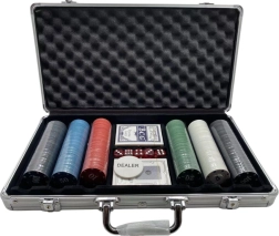 Nyd casinoatmosfæren hvor som helst med dette professionelle pokersæt. Indeholder 500 jetoner i fire farver, to sæt spillekort og fem røde terninger. Alt er opbevaret i en holdbar aluminiumskuffert med håndtag og lås for sikker transport.