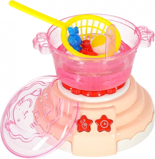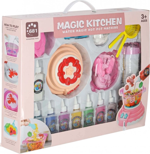 Magisk Køkken er et interaktivt, kreativt sæt inspireret af asiatisk hotpot. Læg forme fyldt med gel i en gryde med en særlig vandopløsning, og på få sekunder opstår originale 3D-figurer. Med 12 nuancer af gel kan du frit blande farver og skabe dine egne kombinationer.