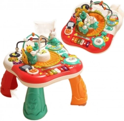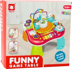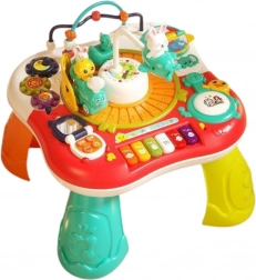 Det interaktive 2-i-1 læringsbord er et alsidigt legetøj, der kombinerer læring og leg. Det byder på klaver, lys- og lydeffekter, telefon, tromme, dreiende hjul, tandhjul samt en bevægelig kanin, som hjælper børn med at opdage farver, former og lyde og udvikle finmotorik og sanser.