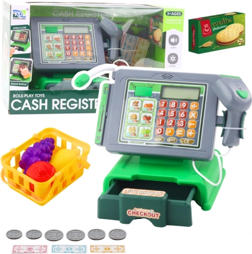 Sjovt og lærerigt legetøjskasseapparat med tilbehør, der giver en realistisk butikleg. Indeholder lys- og lydeffekter, scanner, mikrofon og numerisk tastatur. Medfølger sedler og mønter, indkøbskurv og madvarer for en endnu mere autentisk oplevelse.
