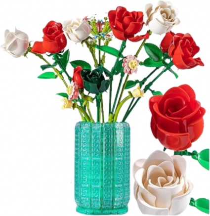 Det elegante byggesæt “roser i vase” forener kreativ underholdning og stilfuld boligdekoration. Af 1022 dele samler du en realistisk buket med røde, hvide og lyserøde roser i en dekorativ vase. Den færdige model på 43 cm er robust, visner ikke og pynter på hylden, bordet eller i arbejdshjørnet. En fremragende gave til børn fra 6 år og voksne byggesætsentusiaster.