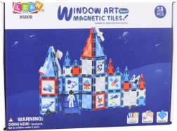 - 58 magnetiske dele i forskellige former og farver, astronautfigur, raket, dekorative fliser med rum-motiver