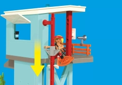 Dette detaljerede sæt byder på et to-etagers redningstårn med hurtig nedfart ad stang, fuldt udstyret livrederpost og et nedre servicehjørne med værktøj. Der medfølger også en strandbuggy til aktioner længere væk fra tårnet, et redningsbræt og en trofast redningshund med vest.