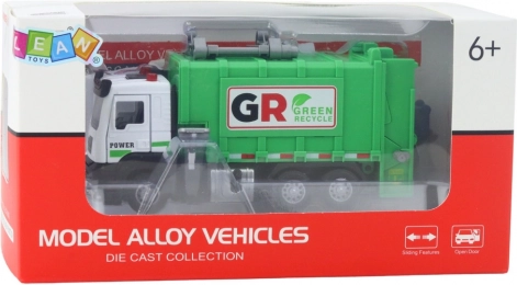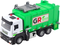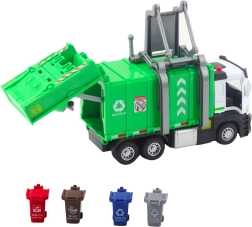 Modellen har en åbningsbar bagklap og en løftemekanisme til containere, så man kan laste og losse affald realistisk. Fire farvede spande motiverer børn til affaldssortering og lærer dem om miljøbeskyttelse. Den robuste konstruktion i plast suppleret med metaldele tåler selv intensiv leg.