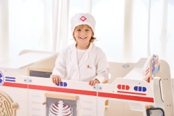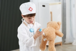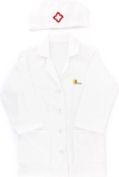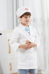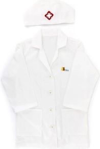 Den hvide kittel og kasketten med medicinsk symbol stimulerer barnets fantasi og giver legen et realistisk præg.