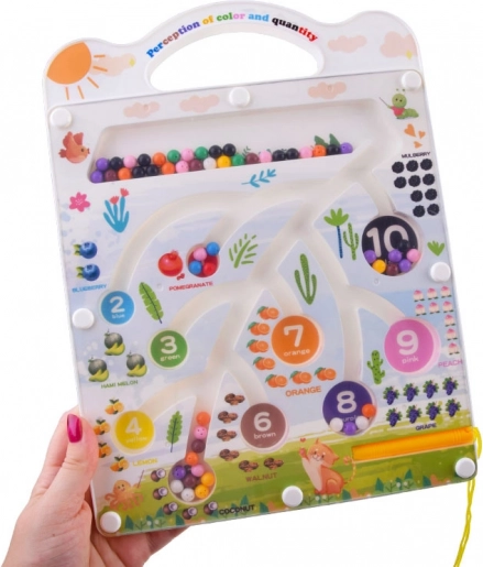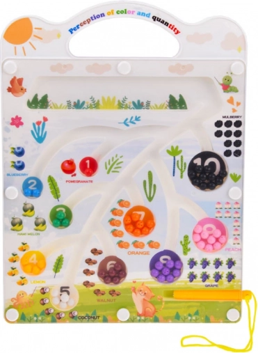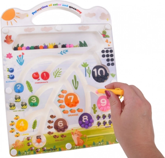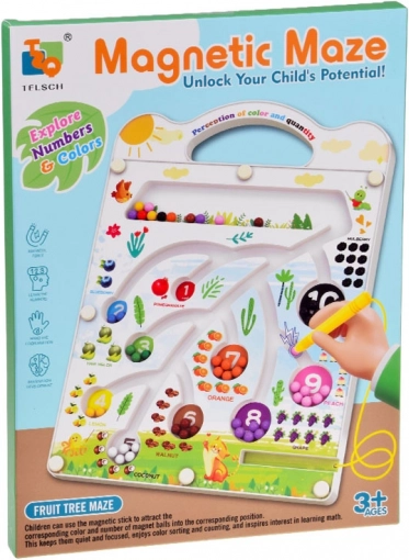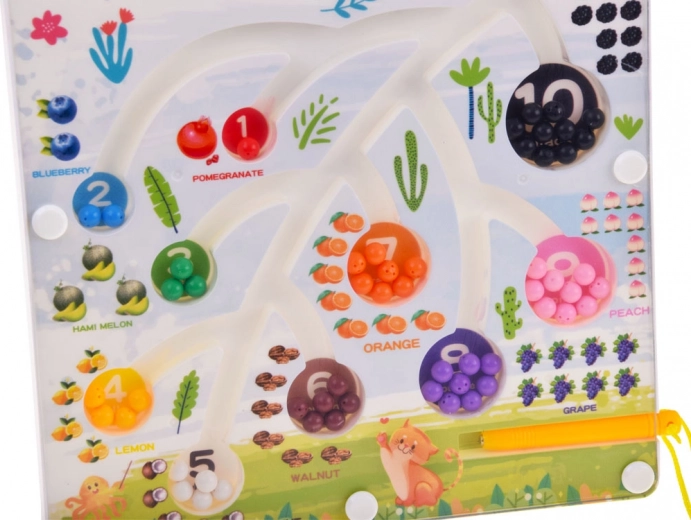 Den interaktive magnetiske tavle med labyrint understøtter udvikling af færdigheder gennem leg. Barnet flytter kuglerne til de rigtige huller med en magnetisk pen og øver farvegenkendelse, at tælle til 10 og sortering. Alle kugler er skjult under et gennemsigtigt låg, så intet bliver væk, og legetøjet er sikkert selv for mindre børn.