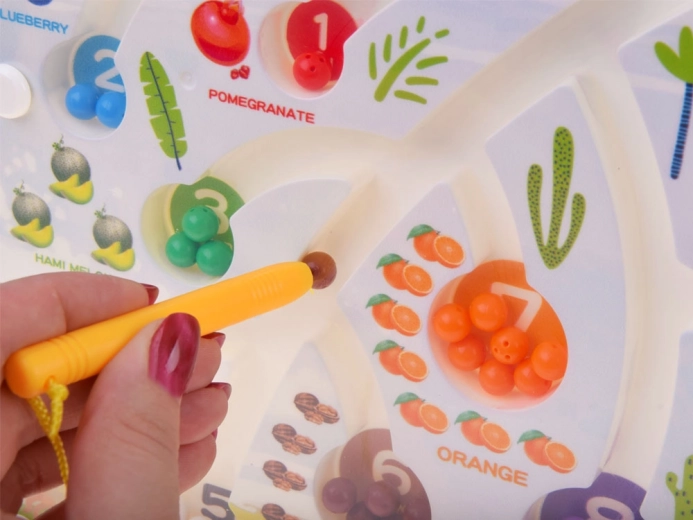 Let konstruktion, et behageligt håndtag og den fastgjorte magnetiske pen i snor gør det nemt at tage tavlen med i bil, tog eller venteværelse. Grafikken er børnevenlig, og engelske etiketter hjælper barnet med naturligt at lære engelske navne på farver og frugter.