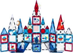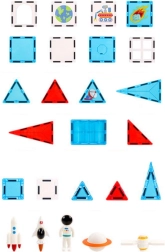 Byg raketter, køretøjer, høje tårne og fantastiske 3D-konstruktioner inspireret af rummet. Magnetiske dele med tryk af astronauter, raketter og planeter motiverer børn til kreativ leg og historier. De gennemsigtige, flerfarvede elementer ser flotte ud i lyset, og takket være de stærke magneter holder formerne stabilt.