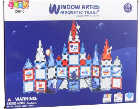 Magnetiske klodser med vinduer og rumtemaer, 90 dele. Stærke magneter, transparente farver, astronautfigur og understel. Understøtter kreativitet og motorik.
