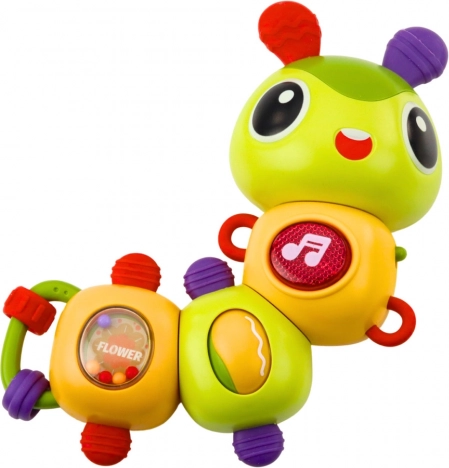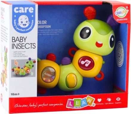 Interaktiv sensorisk larve til børn fra 18 måneder: LED-lys, melodier, 360° roterende elementer, perler, rangle og bidering. Støtter sanser og motorik.