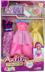 Stilfuldt sæt til små modeelskere: tre smukke kjoler og tilbehør til dukker ca. 29–30 cm høje. Indeholder gylden balkjole, lyserød tylkjole, kjole med dyreprint, to par sko, håndtaske, krone og halskæde. Takket være nem påklædning udvikler det barnets finmotorik, kreativitet og fantasi.
