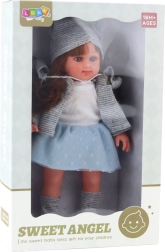 Den søde dukke SWEET ANGEL med en højde på 36,5 cm i et elegant gråt sæt (kjole, lille cardigan, hue og sko) vil glæde ethvert barn. Den er blød, behagelig at røre ved og designet til de mindste – understøtter fantasi, følelser og rolleleg i leg med familie.