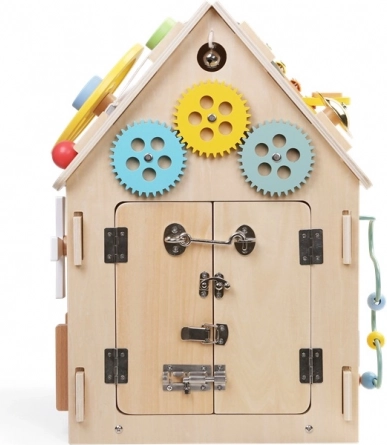 Træbaseret aktivt hus 2Kids Toys til børn fra 3 år. Rat, labyrint, låse, tæller og flere elementer, der udvikler motorik og logik. Sikker udførelse.
