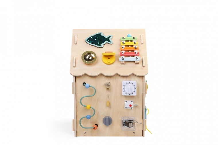 Opdag det træbaserede aktive hus fuld af leg og læring for børn fra 3 år. Hver side byder på interaktive elementer, der udvikler finmotorik, logisk tænkning og sansemæssig opfattelse. Børn vil elske rat og gearskifter, tandhjul, labyrint med kugle, tæller samt træning af låse, lynlås, knapper og snørebånd. Sikker udførelse i kvalitetsnaturtræ og giftfri farver.