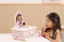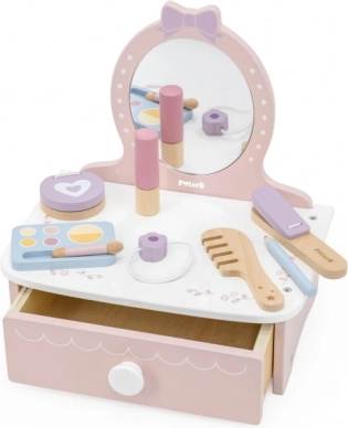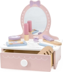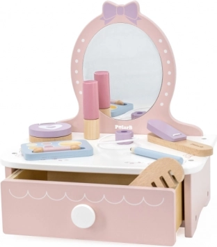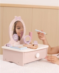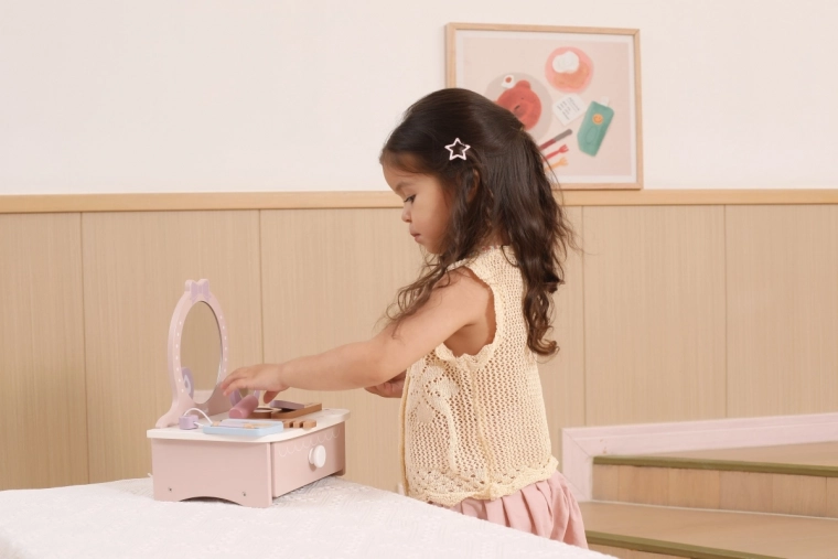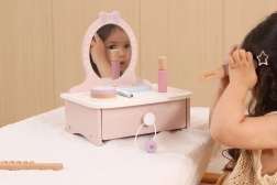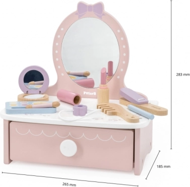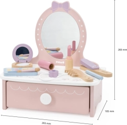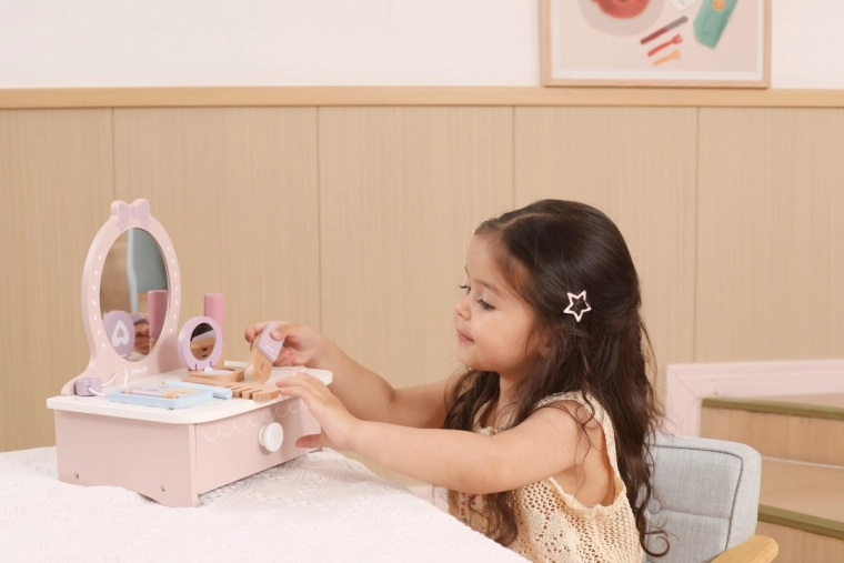 Dette søde toiletbord i træ er et fantastisk supplement til ethvert børneværelse. Det støtter fantasi, social leg og finmotorik. Takket være den robuste trækonstruktion er det sikkert og holdbart til daglig leg.