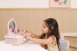 Toiletbordet er pakket i en solid æske og egner sig derfor også som gave. Et godt valg til små pyntedukker fra 3 år, som elsker at efterligne voksne og udvikle fantasien.