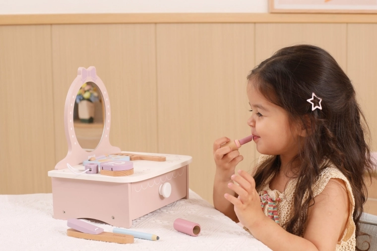 Stilfuldt børne-toiletbord i træ giver timevis af kreativ leg. Indeholder bord og sikre trætilbehør som kam, krøllejern og make-up. Ideelt til børn fra 3 år. Holdbart trædesign, rigt tilbehør og kompakte mål for nem placering på børneværelset.