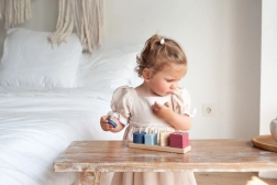 Træpuslespillet Cubika Pastel Sortering af Former V bringer legende læring gennem sjov. Børn sorterer og trækker 16 perforerede geometriske former ned over pindene på den rektangulære base, træner hånd-øje-koordination og lærer at genkende farver og former.
