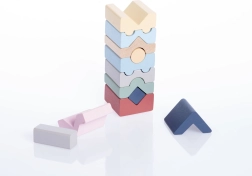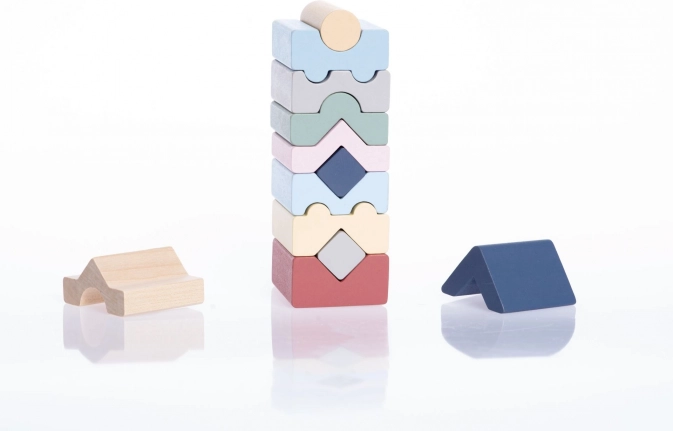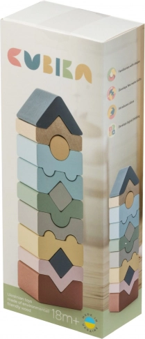 Pasteltårn XI fra Cubika er et gennemtænkt træpuslespil med 12 dele i blide pasteltoner. Børn trækker delene på og stabler dem, så de passer korrekt sammen og danner et stabilt tårn på 16 cm i højden. Takket være den præcise træforarbejdning er legetøjet behageligt at håndtere og sikkert for små børnehænder.