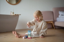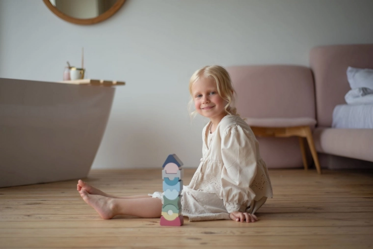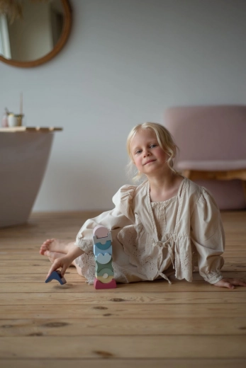 Dette pastelfarvede balance-tårn indeholder 11 præcist bearbejdede trædele, som skal passe korrekt sammen. Takket være de afrundede former og den gennemtænkte konstruktion kan tårnet ikke kun bygges lodret, men også sikkert vippes til begge sider for at træne tålmodighed og finmotorik.