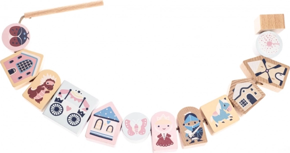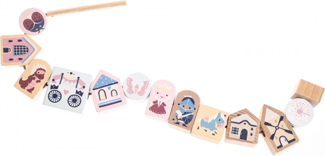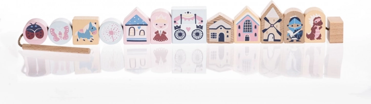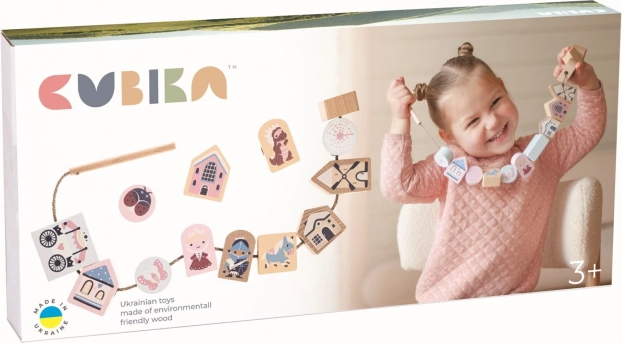 Træ-snøresæt CUBIKA Pastel: 12 dele, 8 skabeloner, snor 45 cm. Udvikler finmotorik og hukommelse. Sikker vandbaseret maling, TÜV-certificering, EN 71.