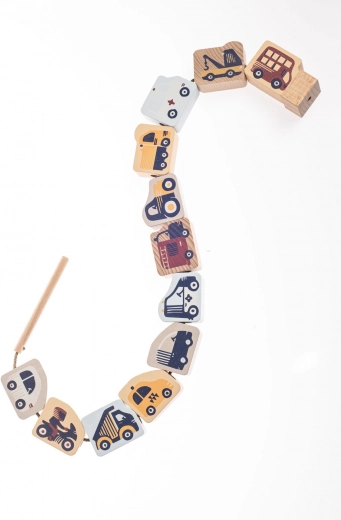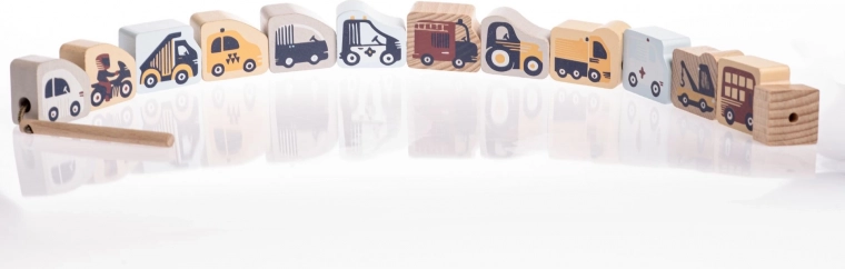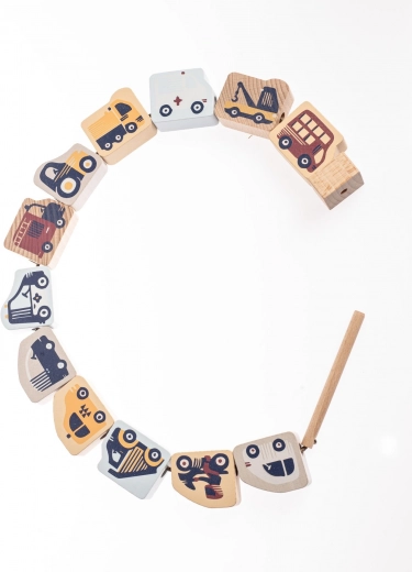 CUBIKA pastelfarvet snorsæt med transportmotiver. Trædele, snøre, 8 forlæg. Udvikler motorik og hukommelse. Sikre farver, TÜV- og EN 71-certificeret.
