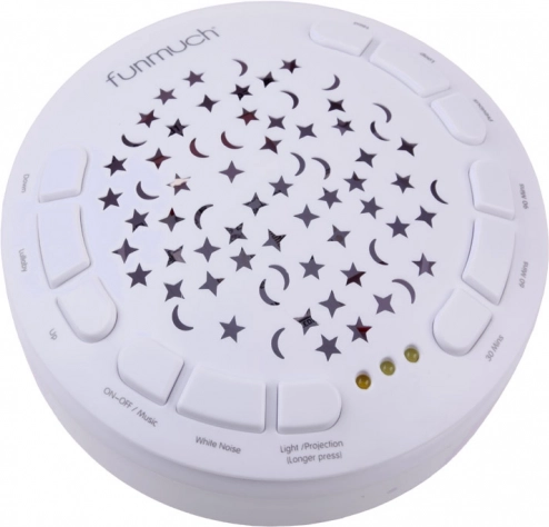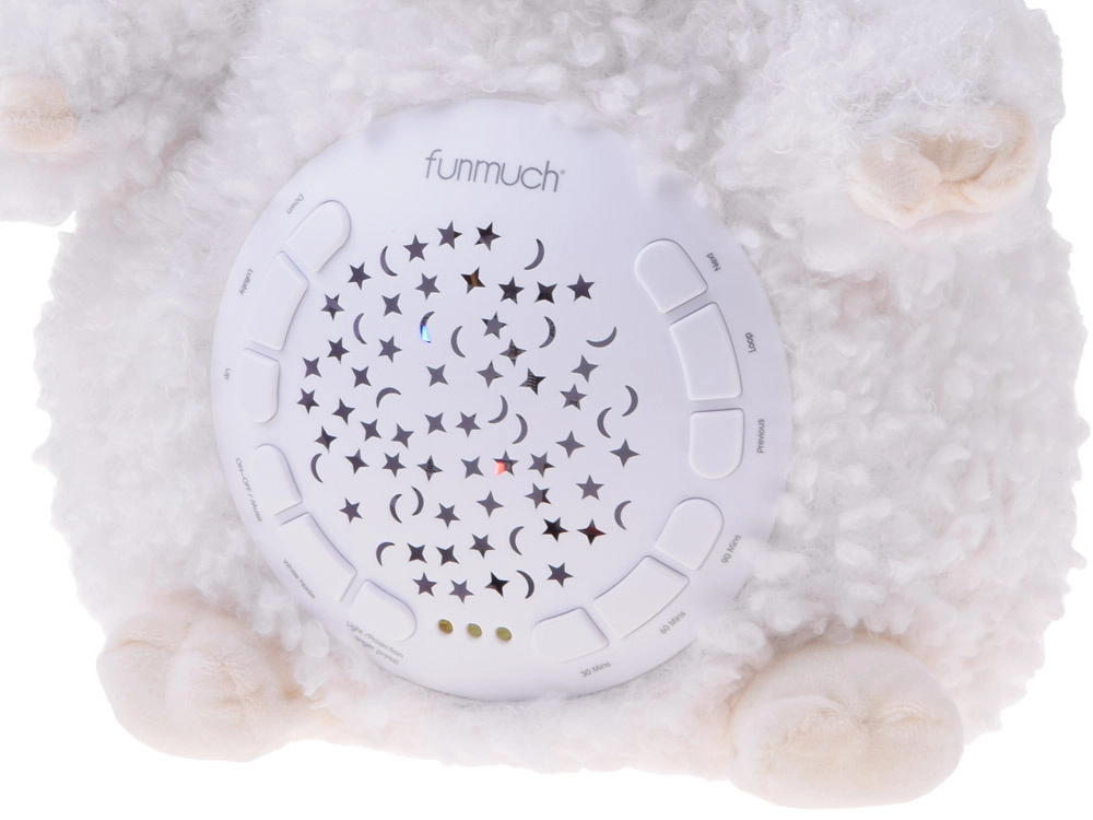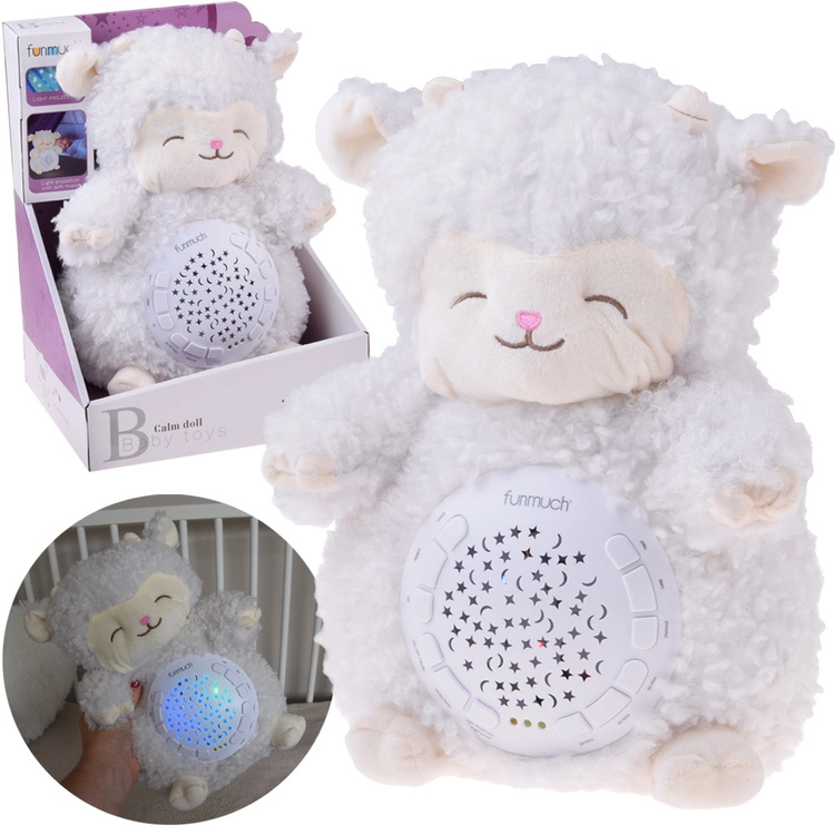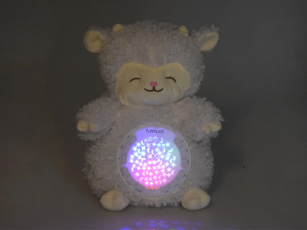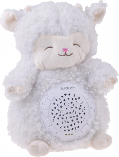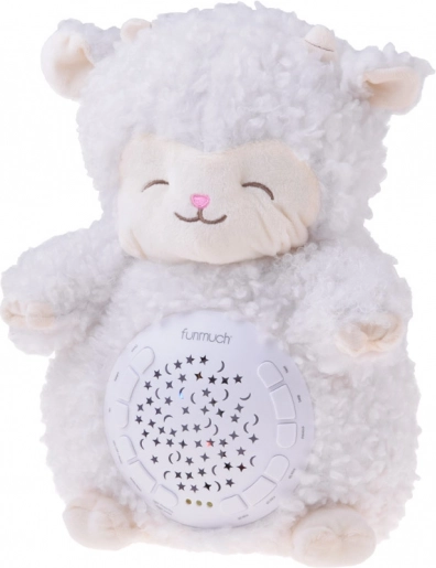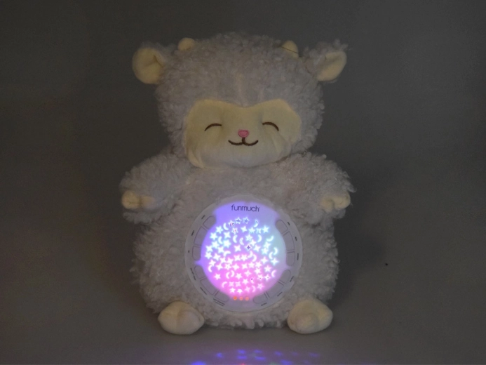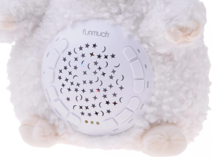Dette bløde, krammevenlige får skaber en magisk atmosfære på børneværelset for rolig søvn. Den farvede lysprojektion af stjerner og måner på vægge og loft sammen med blide melodier, havsus eller regn hjælper barnet med at falde til ro og føle sig trygt.