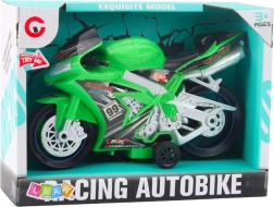 Denne grønne racermotorcykel vil begejstre alle små fans af fart og motorsport. Den er lavet af holdbar plast, har en stabil base og brede hjul for sikker kørsel på forskellige overflader. Når knappen trykkes, aktiveres lyseffekter og realistiske motorlyde, som forstærker legeoplevelsen.