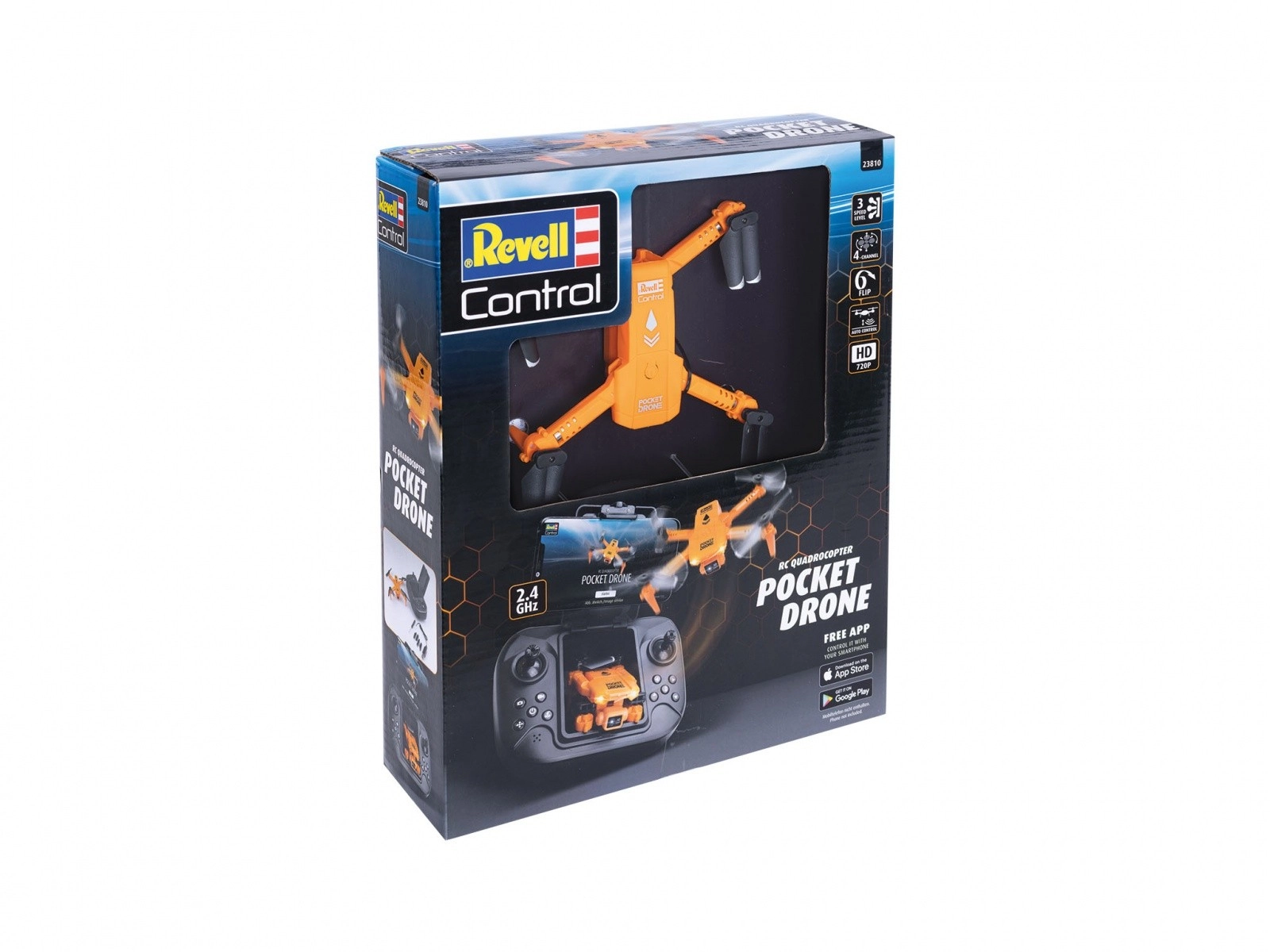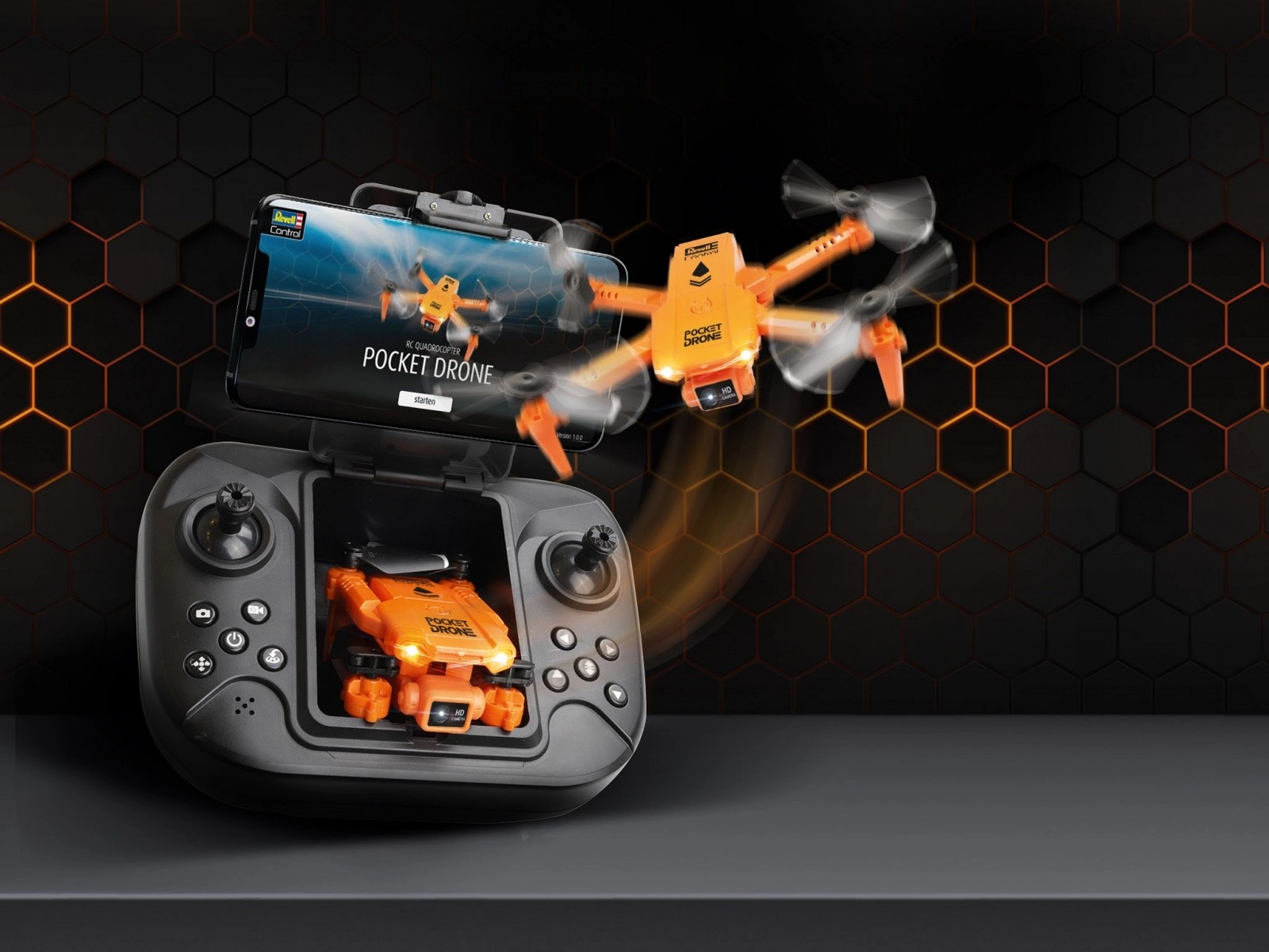 Lommendronen REVELL Control leverer masser af sjov i et lille format. Med en længde på 110 mm, bredde på 134 mm og højde på 35 mm passer den nemt i controllerens rum og er altid klar til flyvning. Det indbyggede 720p-kamera sender grundlæggende fotos og video live til din smartphone, så du ser verden fra en ny vinkel.