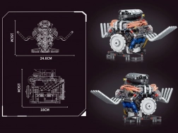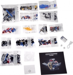 Der medfølger nummererede poser for nem oversigt, USB-kabel til opladning samt en overskuelig billedvejledning. Den effektfulde røde belysning giver modellen et imponerende udseende og fremhæver de bevægelige dele.