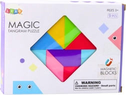 - 9 magnetiske tangram-dele, instruktion, klistermærker, emballage