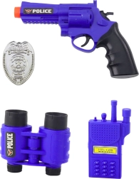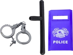 Inkluderer 9 vigtige tilbehørsdele: hjelm, håndjern med nøgler, pistol, kikkert, walkie-talkie, stav, badge og beskyttelsesskjold. Alt i elegant mørkeblå farve med sølv- og sorte detaljer. Sættet fremmer kreativitet, samarbejde med jævnaldrende og udvikling af kommunikationsfærdigheder.