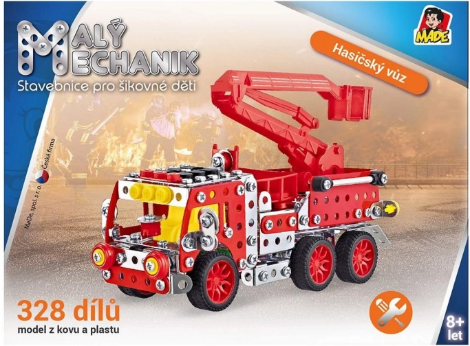 Byggesæt Lille mekaniker: brandbil med lift, 327 dele. Udvikler motorik, kreativitet og problemløsning. Metal og plast, til børn fra 8 år.