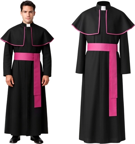 Klassisk præstekostume med lang soutane, kappe med krave og lilla bælte er et færdigt kostume ideelt til Halloween, karneval, cosplay og teaterforestillinger. Løs pasform i universel størrelse XL/XXL giver komfort og nem påklædning, mens det realistiske udseende tiltrækker opmærksomhed ved enhver begivenhed.