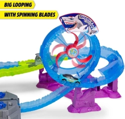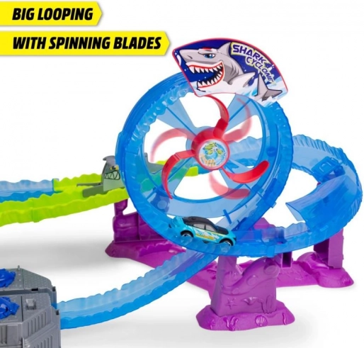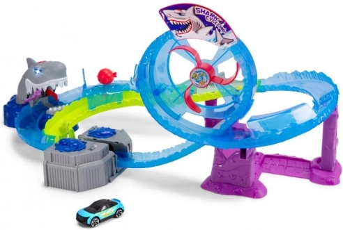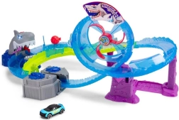 Banen imponerer også med lyseffekter og truende undervandslyde, inklusive hyl fra hajen, som forstærker stemningen i legen. I pakken medfølger en metalbil, så I kan race med det samme efter udpakning.