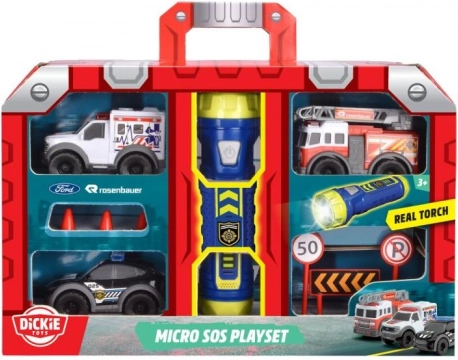 Dette SOS mikro-sæt bringer en komplet redningsaktion ind på børneværelset. Tre detaljerede mini-køretøjer med friløb – brandbil, politibil og ambulance – er ideelle til kreativ leg og træning af trafiksituationer. Sættet indeholder også vejskilte og en praktisk lygte med tre lysfunktioner, som giver legen ekstra autenticitet.