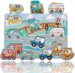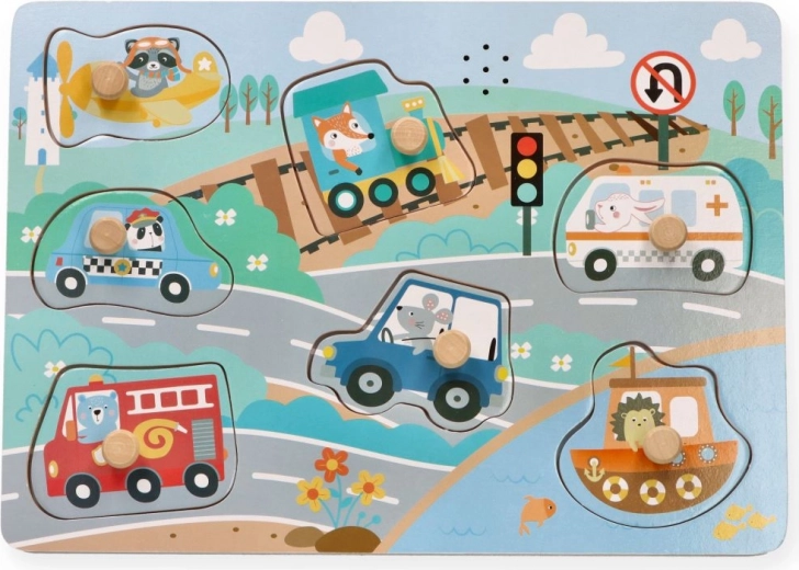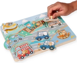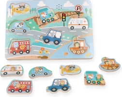 Disse interaktive træpuslespil med lyde er et fremragende valg til den første introduktion til transportens verden. Hver brik forestiller et andet køretøj, og når den placeres korrekt, høres en autentisk lyd, som motiverer børn til gentagen leg og læring.