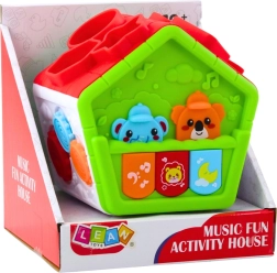 Huset tilbyder 3 musiktilstande (sange, melodier, dyrelyde), lærer farver og tal og giver rige sanseindtryk for syn, hørelse og følesans. Den sikre udførelse uden skarpe kanter og kvalitetsmaterialer sikrer tryg og glædesfyldt leg.