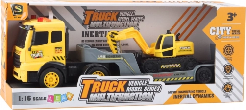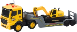 Dette detaljerede byggesæt kombinerer en stor trækker med lavtrailer og en realistisk larvefodskl gravemaskine. Takket være Friction Power er det nok at skubbe køretøjet, hvorefter det kører af sig selv, mens belyste effekter og lyde af motorstart, motorgang, horn og bakning giver legen autenticitet. Den nedklappelige bagrampe på lavtraileren muliggør nem på- og afkørsel af maskinerne.