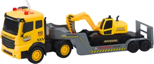 Et realistisk sæt med lastbil, lavtrailer og larvefodskl gravemaskine i skala 1:16, der giver timevis af sjov for små fans af byggemaskiner. Køretøjet har Friction Power for jævn igangsætning, lys- og lydeffekter samt en lavtrailer med nedklappelig rampe. Gravemaskinen drejer 360°, og dens skovl styres med en sidehåndtag – alt fremstillet af høj kvalitet og sikker plast.