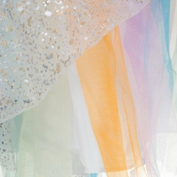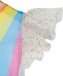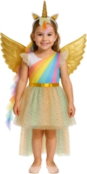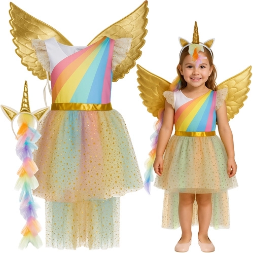 Det magiske sæt til små fantasi-elskere indeholder alt til en øjeblikkelig forvandling – en glitrende nederdel med stjerner, gyldne vinger med elastikker og et hårbånd med ører, man og horn. Takket være den enkle påklædning over hovedet og elastiske elementer er kostumet hurtigt klar til sjov uden kompliceret lukning.