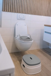 Sættet omfatter en udtagelig inderskål for nem og hurtig rengøring, en aftagelig toiletsædereduktion til standardtoiletter samt en praktisk skammel med sidegreb, der hjælper barnet med at nå håndvasken eller højere steder.
