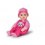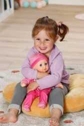 Sættet indeholder en flaske til at efterligne fodring, en stilfuld heldragt og en hue i matchende mørkerosa. Dukken er designet til små børn fra 1 år for at være sikker, let og nem at holde om.